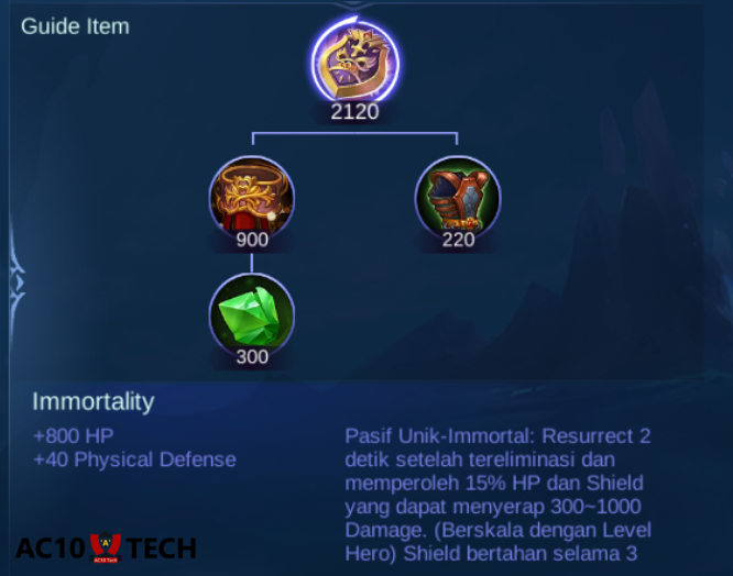 Immortality adalah item yang dapat menghidupkan kembali nyawa kalian ketika dibunuh oleh musuh (Unique Passive: Immortal – Resurrect 2s setelah kematian dan dapatkan 15% HP dan perisai yang dapat menyerap 300-1000 poin kerusakan. (Skala dengan level pahlawan) Perisai bertahan 3 detik. Efek ini memiliki CD 180 detik.)